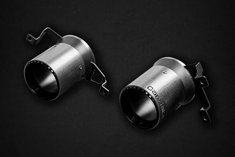 Set of tailpipes, consisting of a stainless steel inner tube, a colored anodized aluminum tube (black and silver*), and a carbon outer tube. Please specify the desired finish when ordering!