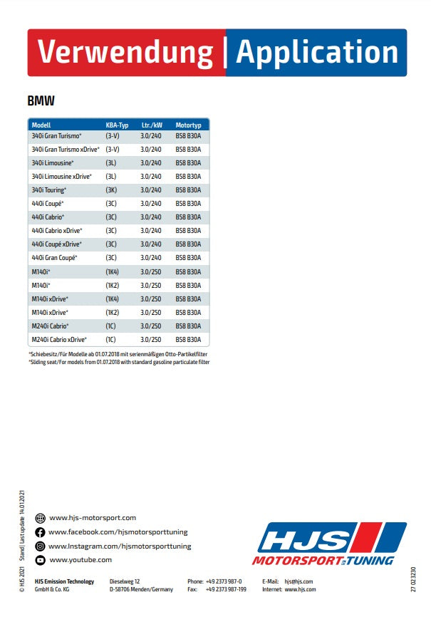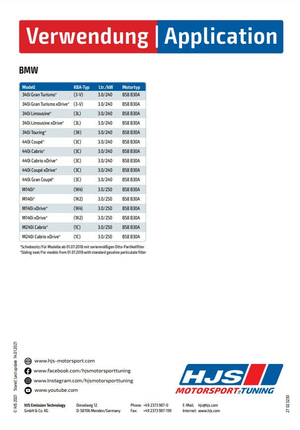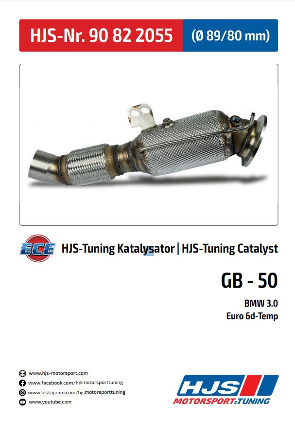 90822055 HJS ECE Downpipe / Kat BMW M140i / M240i / 340i - 440i 3.0 - Euro 6d - OPF